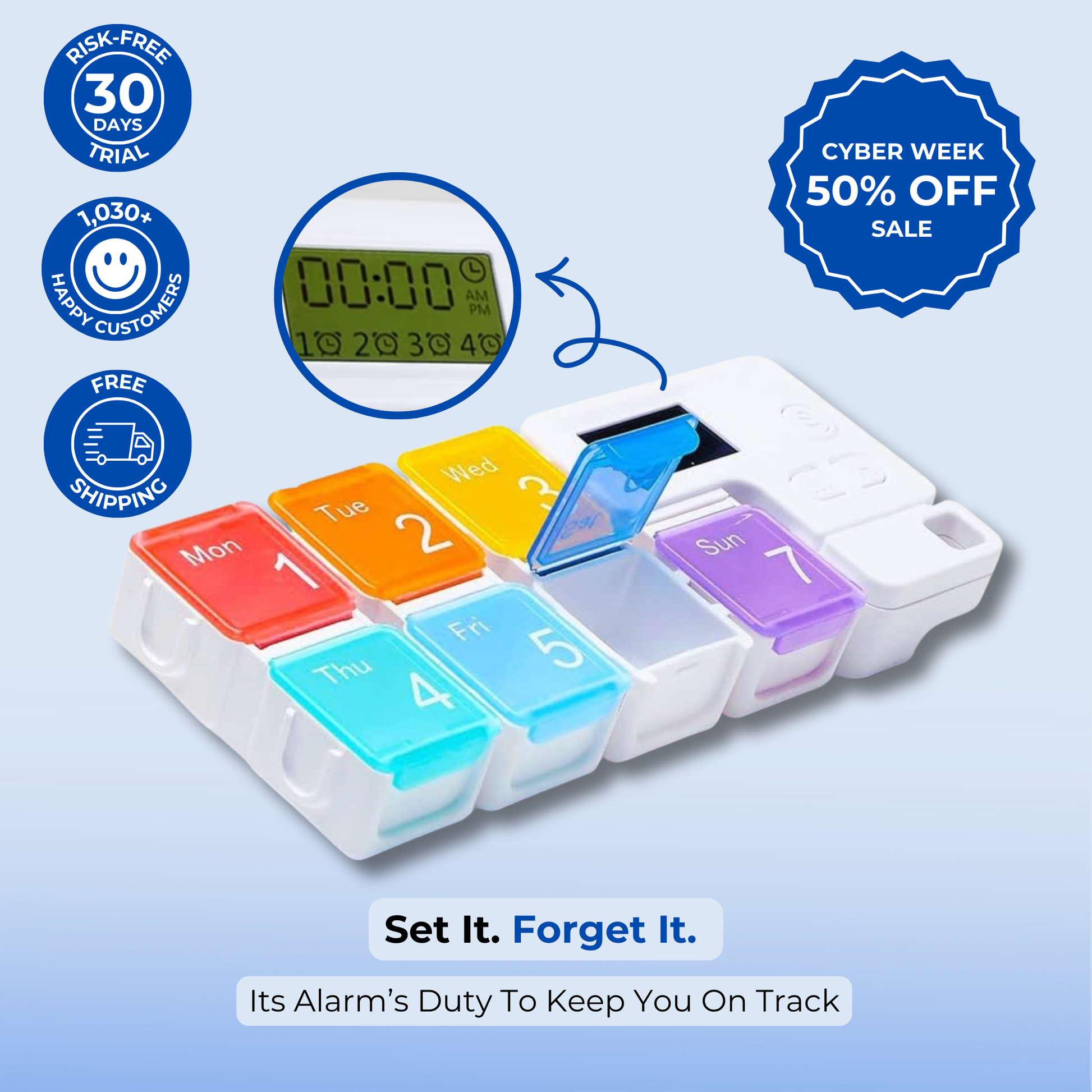 Stay on track effortlessly. No more double-dosing, missed pills, or daily frustration.